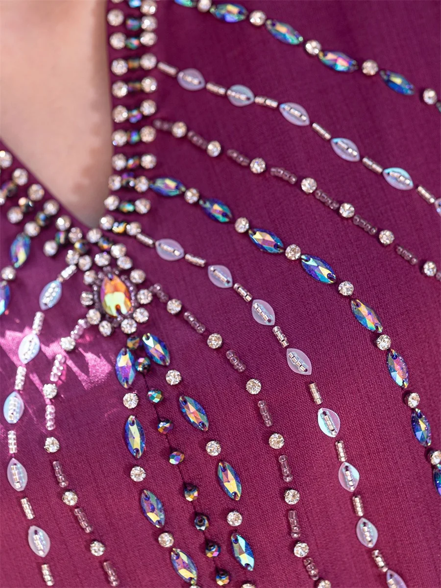 قفطان مغربي انيق مصنوع من قماش البوليستر ناعم وخفيف يوفر راحة مثالية. يتميز بتصميم فاخر مزين بتطريزات من حجز الراين المغربي ( حجز كرستالي ) مما يضفي عليها لمسة من الفخامة والرقي. مناسب للمناسبات الخاصة والاطلالات اليومية
